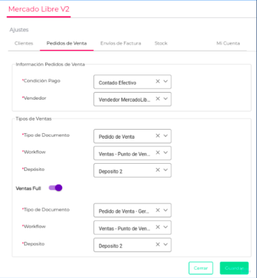 - Ventas Full: Si se activa, habrá que configurar Tipo de Documento, Workflow y Depósito.