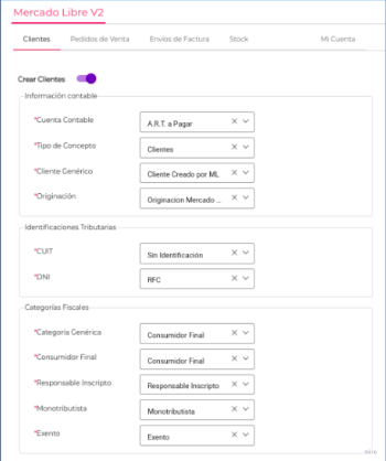 Crear Cliente: si el cliente de Mercado Libre no se encuentra registrado en el ERP, se dará de alta, según los parámetros definidos el nuevo cliente en la base de ERP.