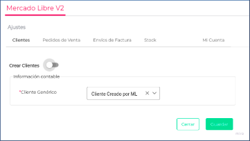 En el caso de que el cliente de ML no exista en el ERP, y no se desee crear un nuevo cliente, tendrá la opción de generar un cliente genérico, desactivando la opción Crear Cliente y configurando un Cliente genérico.