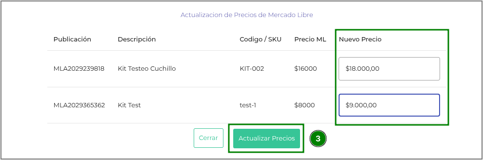 Presionar sobre la acción “Actualizar precios manualmente”: el sistema mostrará una nueva pantalla con los productos seleccionados para modificar cada uno de los valores en el cuadro de texto “Nuevo precio”. Con esto se actualizan los precios de las publicaciones de Mercado Libre.