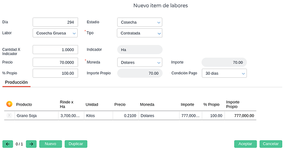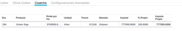 A diferencia del resto de las Labores, la cosecha es la única que genera un ingreso de stock. Para esto se define cuál es el grano cosechado, su rendimiento por hectárea y su precio.