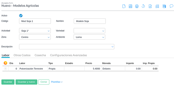 Se define cuál es la labor, si es propia o contratada y la cantidad de veces que se aplicará según el indicador que en la mayoría de las veces es Hectárea u Horas, aunque también puede ser otro.