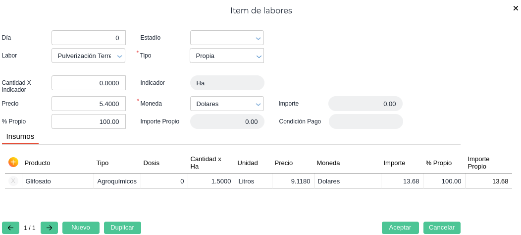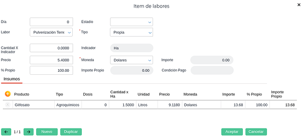 Hecho esto, se cargan los insumos a utilizar en la Labor. Esto contempla el producto, su cantidad por hectárea, dosis y su precio.