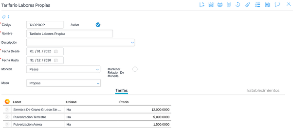 Se define su fecha de vigencia, su moneda y la tarifa para cada labor, como así también los Establecimientos para los cuales estará disponible.