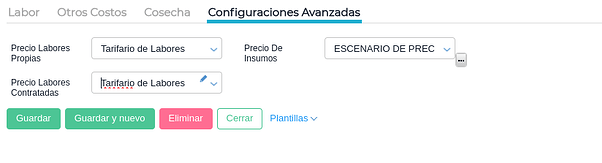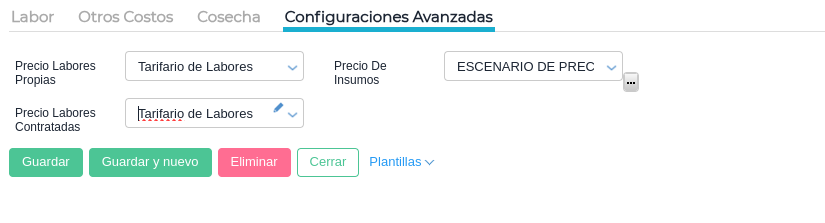 En la solapa de configuraciones avanzadas se puede precisar un tarifario de labores propias, otro de contratadas y un escenario de precios. Como se mencionó anteriormente esto es de mucha utilidad para evitar la definición manual del precio de las labores e insumos.