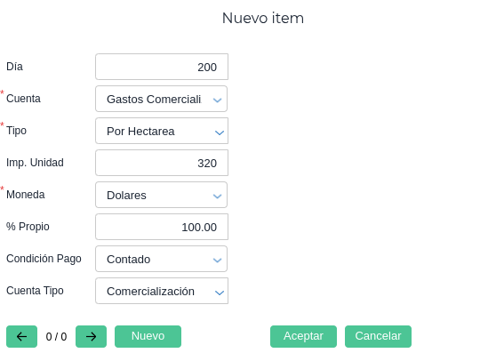 Para esto, establecemos el intervalo del día en que se computará dicho gasto, su correspondiente cuenta, si se calculará por hectárea, por unidad producida o por importe fijo, el importe, la moneda, el porcentaje propio, la condición de pago y su cuenta.