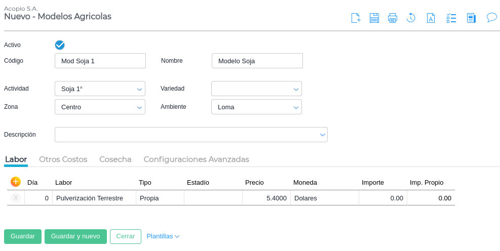 En el caso de que se trabaje con lista de precios para las labores, este campo puede no ser indicado y tomará el valor del tarifario asociado al modelo.