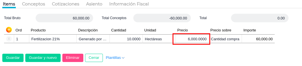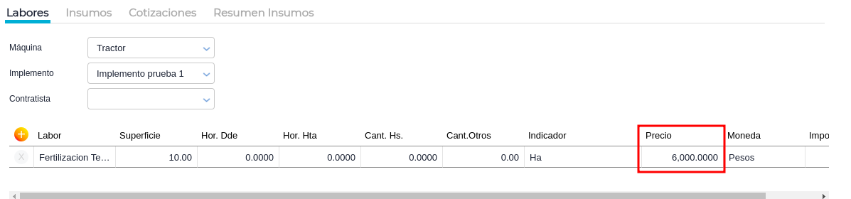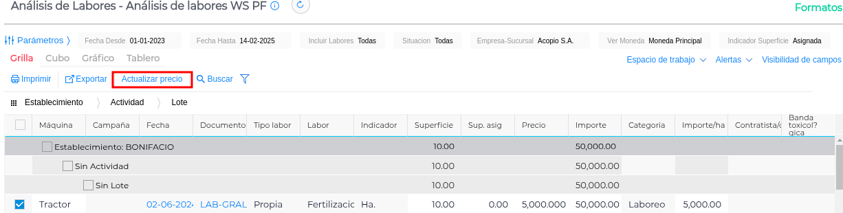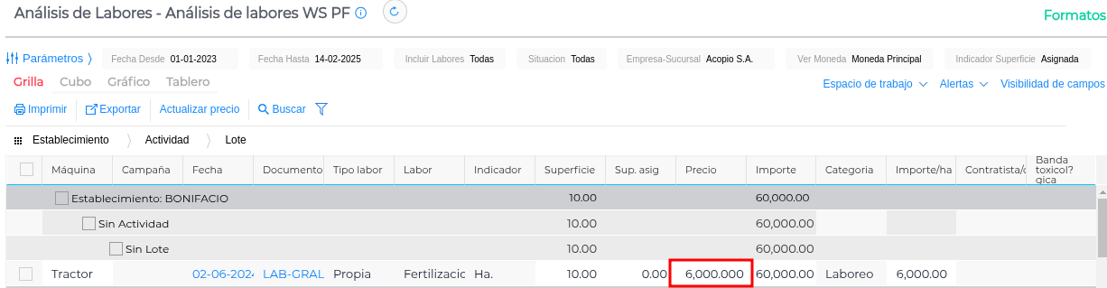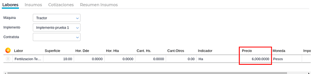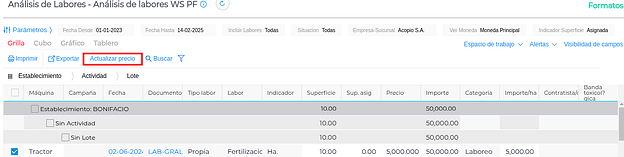 En la grilla se observará el cambio de precio, importe, importe por hectárea y moneda de la transacción para el laboreo.