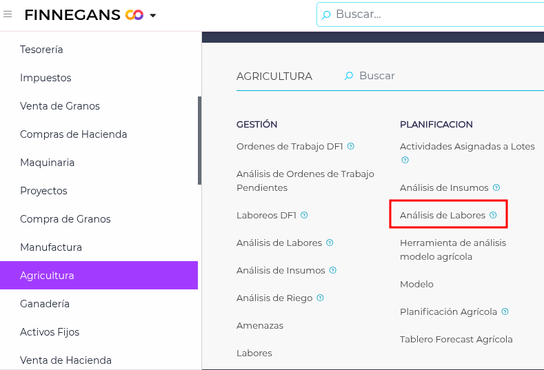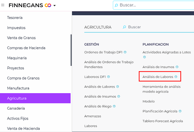 Para usar esta funcionalidad, se deberá acceder mediante Agricultura → Planificación → Análisis de labores.