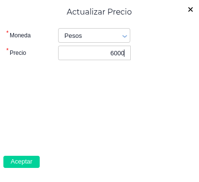 Una vez seleccionado actualizar precio, tendremos una ventana emergente donde se seleccionara la moneda y el precio de la labor, en este ejemplo se cambió de 5000 a 6000 pesos. Cabe destacar que es posible elegir cualquier moneda del respectivo maestro.