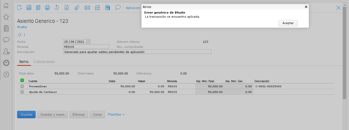 El sistema emite el mensaje “La transacción se encuentra aplicada.” cuando se intenta modificar una transacción.