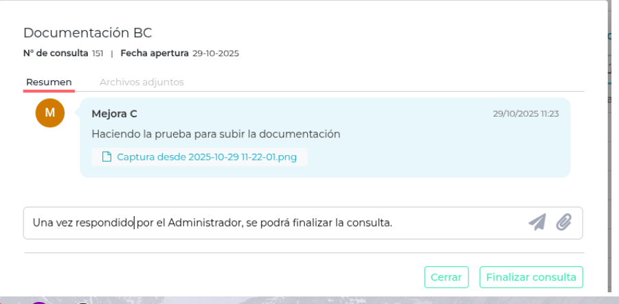 La opción “Finalizar consulta” en la vista de pop-up podrá ser utilizada solo una vez que haya enviado la respuesta el usuario Administrador.