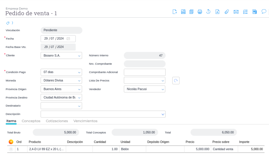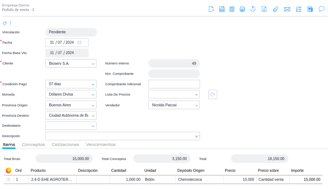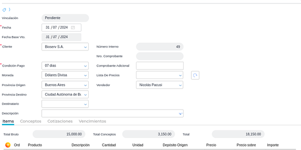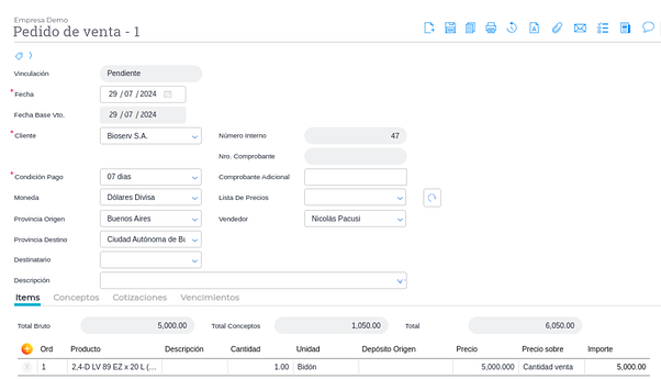 - Si un documento no contable (Ej. “Pedido de venta”) está parcialmente vinculado, se define precio por la cantidad de lo que este pendiente, ya que el informe muestra documentos no contables pendientes.