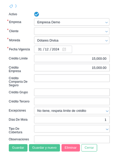 - Activo: indica si el registro se encuentra o no activo. Para que se realice el control de crédito en esta empresa, el registro debe estar activo.