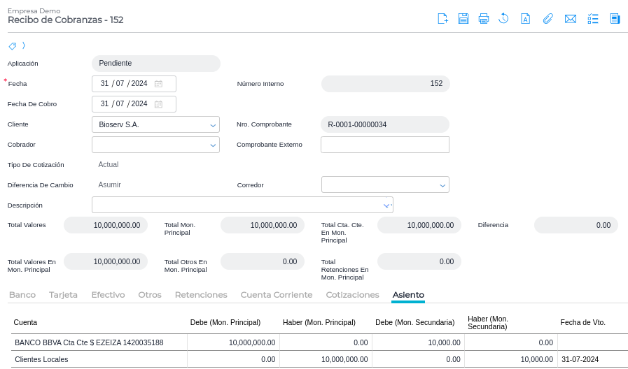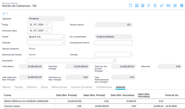 Menú → Gestión empresarial → Tesorería → Transacciones → Cobranzas