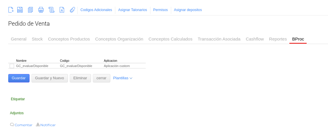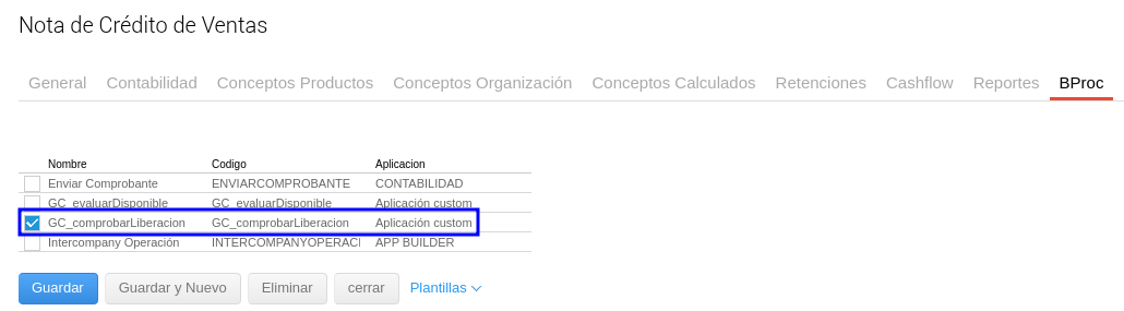 Posteriormente, en los documentos que consumen crédito, por ejemplo los pedidos de venta, se debe activar el bproc GC_evaluarDisponible y en los que liberan crédito, por ejemplo los recibos de cobranza, se debe activar el bproc GC_comprobarLiberacion