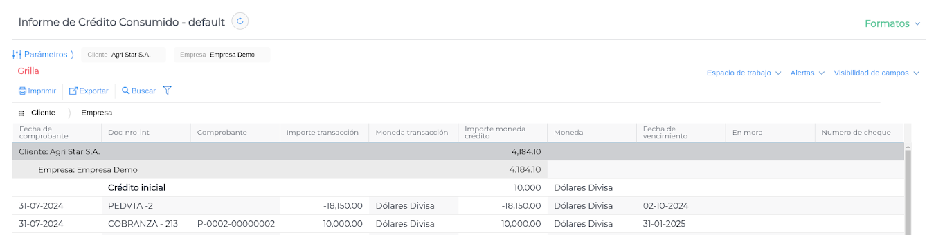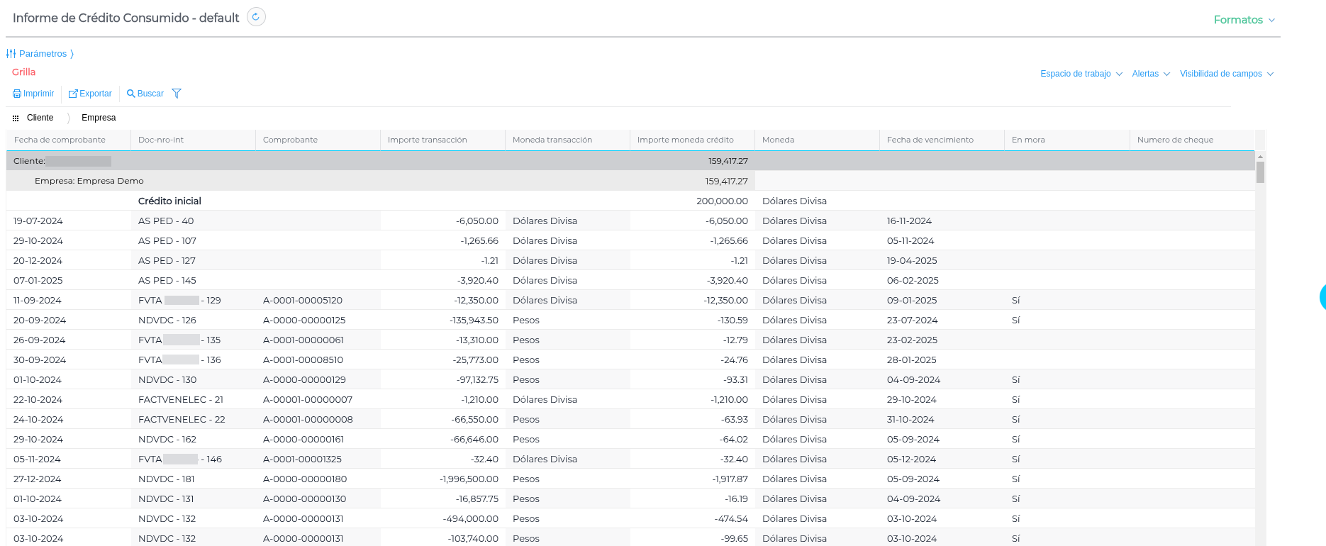 - El informe tiene un formato por defecto, es decir agrupado por cliente, de modo que la fila del cliente, en la columna “Importe moneda crédito” se visualice el crédito disponible de ese cliente. La segunda agrupación es la empresa. De este modo se visualiza el credito disponible, por cliente/empresa.