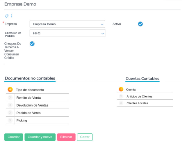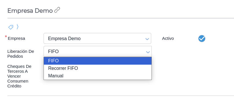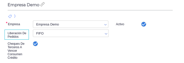 Si se define una configuración de crédito para una empresa pero esta se encuentra inactiva, no se va a controlar el crédito. - Liberación de pedidos: este campo permite definir el modo en que se van a liberar los pedidos que consumen crédito.