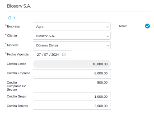 - Activo: indica si el registro se encuentra activo o no. Para que el control de crédito se ejecute correctamente el crédito por cliente debe estar activo.