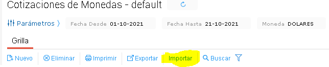 El sistema brinda la posibilidad de importar cotizaciones de monedas a partir un archivo de excel.