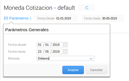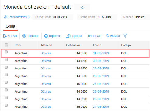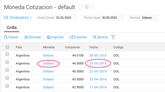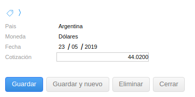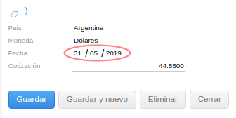 En el siguiente ejemplo vamos a modificar la cotización de la moneda dólar para la fecha 23-05-2019.