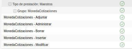 Moneda y Moneda Cotización comparten los permisos de tipo maestros para borrar, insertar, modificar, adjuntar, crear tag y administrar. Por ejemplo: el usuario que pertenezca a un equipo con permiso para insertar una moneda también cuenta con permiso para insertar una cotización.