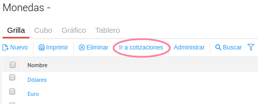 Accedé al maestro de monedas desde Menú → Contabilidad → Moneda Cotización o desde el maestro de monedas desde el botón “Ir a cotizaciones”.