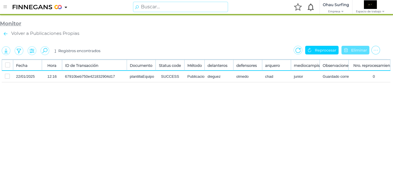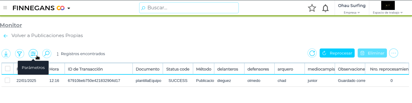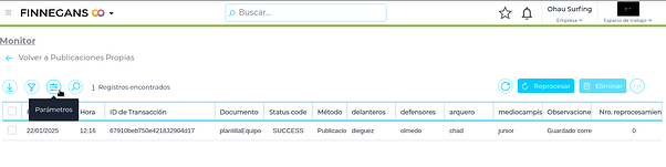 Al acceder al monitor, visualizamos la siguiente pantalla, la cual muestra a modo de columna los campos marcados como visibles en el SCHEMA y también los registros de hoy por defecto y en caso de querer visualizar registros anteriores, deberemos configurar los parámetros haciendo click en el icono de parámetros.