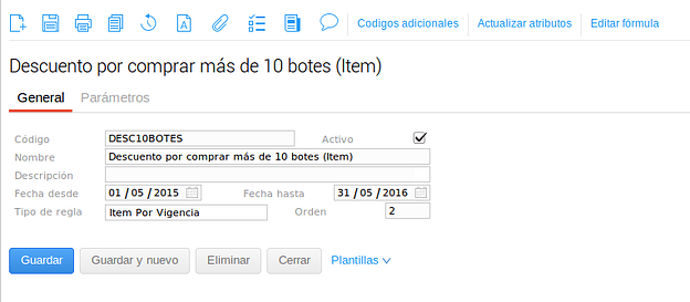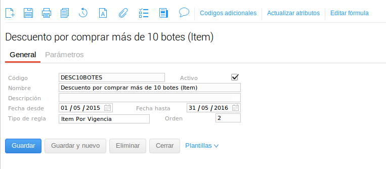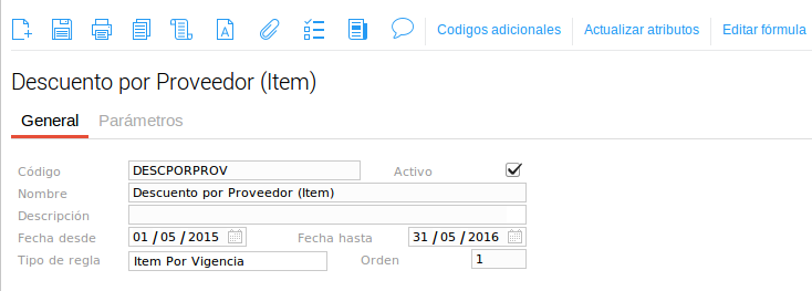 Cada regla indistintamente, si es de ítem o global, debe tener su código, su nombre y descripción y debe indicar si está activa o no.
