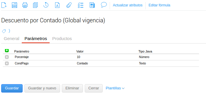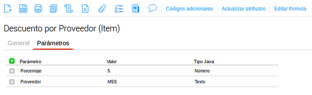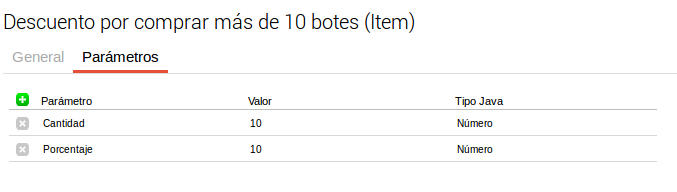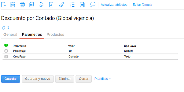Permite indicar los parámetros que se tendrán en cuenta a la hora de programar el descuento. Por ejemplo, si se quiere tener en cuenta la condición de pago, se agrega un parámetro CondPago que tenga como valor el código, o el nombre. El campo Tipo Java es para diferenciar entre texto y número.