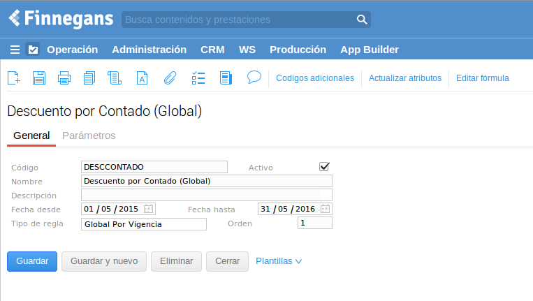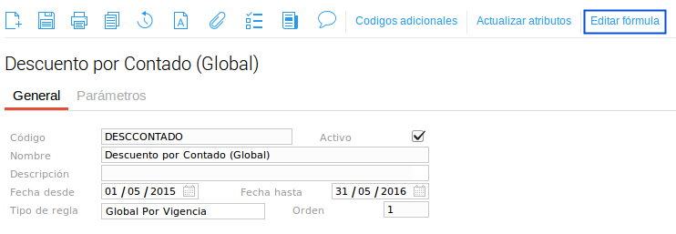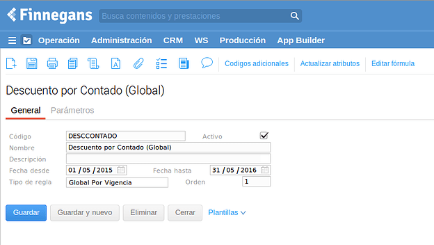 Tiene una fecha desde 01/05/2015 y fecha hasta 31/05/2016 y Orden = 1 (es la única regla global configurada)
