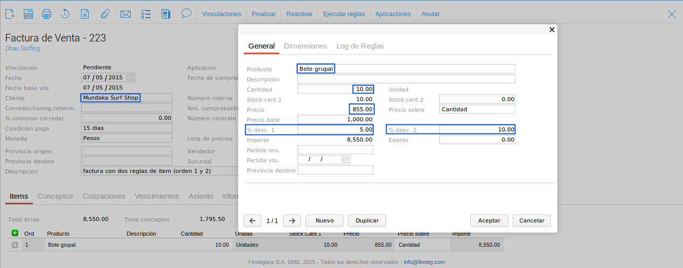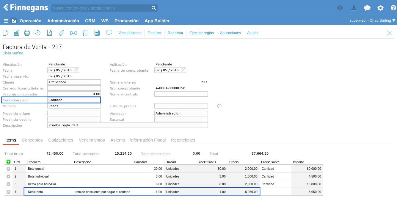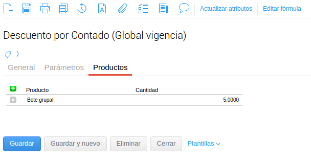 Ejecutar reglas: se utiliza solo para las reglas globales, y funciona para poder ver cómo quedará la factura con los descuentos aplicados antes de guardar, ya que cada vez que se guarda también se ejecutan las reglas.