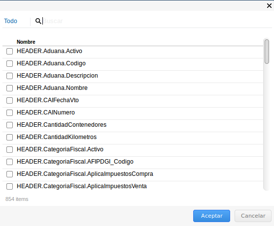 Atributos: Los atributos pueden ser de tipo HEADER o de tipo ITEM. Esta lista contiene todos los atributos que se pueden usar en un documento y además trae los de los maestros. Ejemplo: HEADER.Producto.Codigo es el código del producto puesto en el maestro.