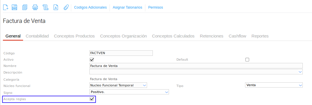 Se debe configurar cuáles tipos de documento permiten el cálculo de reglas con una tilde “Acepta Reglas”.