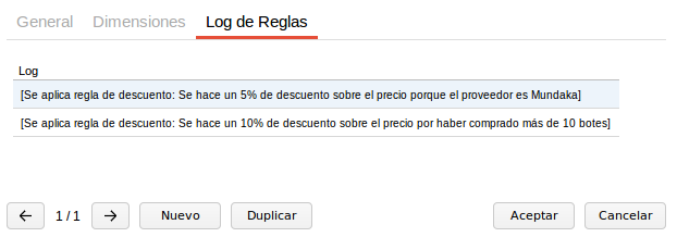 log(“Se aplica regla de descuento: Se hace un 5% de descuento sobre el precio porque el proveedor es Mundaka”);