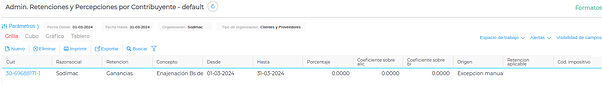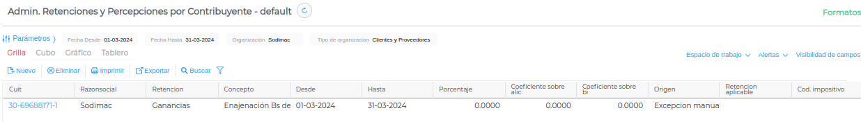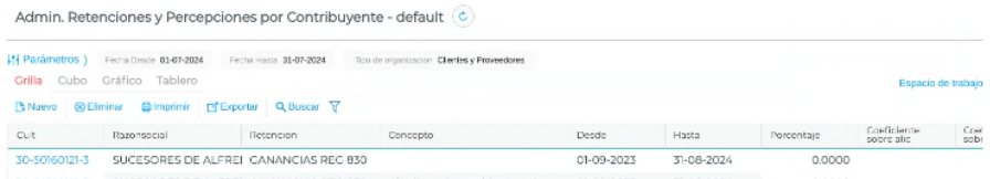 Gestión empresarial → Impuestos → Admin. Retenciones y Percepciones por Contribuyente