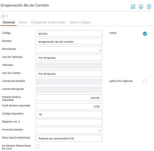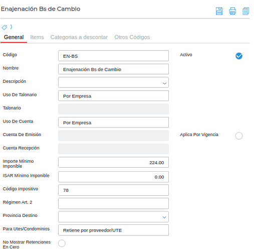 Activo: Indica si el tipo de retención creado se encuentra o no disponible para su selección y utilización.