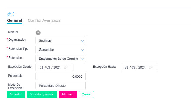 Porcentaje: debe ser 0 para que no retenga nada.