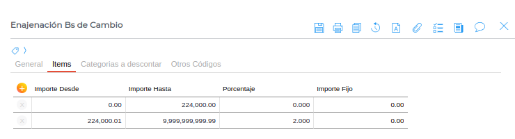 Las mismas deben configurarse según la normativa vigente. Cabe destacar que la primera línea corresponde siempre a lo que AFIP denomina como “Montos no sujetos a retención”, por lo que va desde 0 hasta el importe que corresponda por cada concepto. En el ejemplo de la imagen, para enajenación de bienes de cambio el monto no sujeto a retención es hasta $224.000, por lo que la primera línea se configura desde el importe 0 hasta el 224.000 con un porcentaje de 0%.