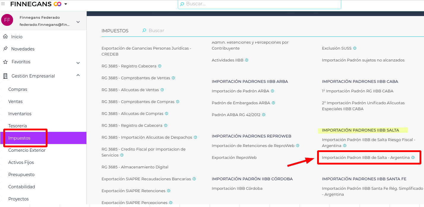 Importante: Si no se ve el importador en el menú o desde la barra del buscador, solicitarle al administrador que otorgue el permiso “Importación Padron IIBB de Salta - Argentina - Acceder”.
