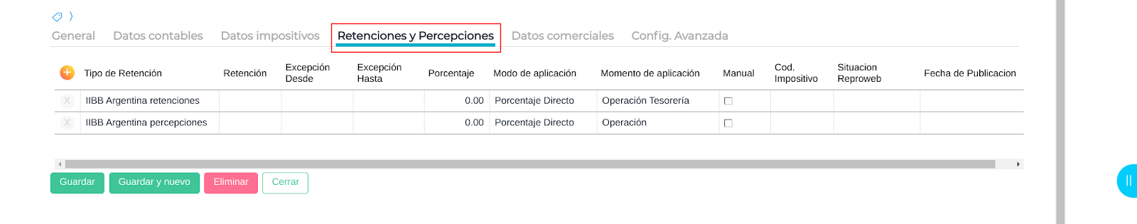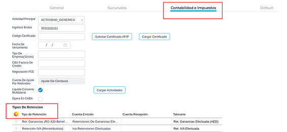 En la solapa Contabilidad e impuestos sección Tipos de retención se deben agregar los tipos de retención IIBB Argentina Retenciones e IIBB Argentina Percepciones, siempre y cuando tributen.