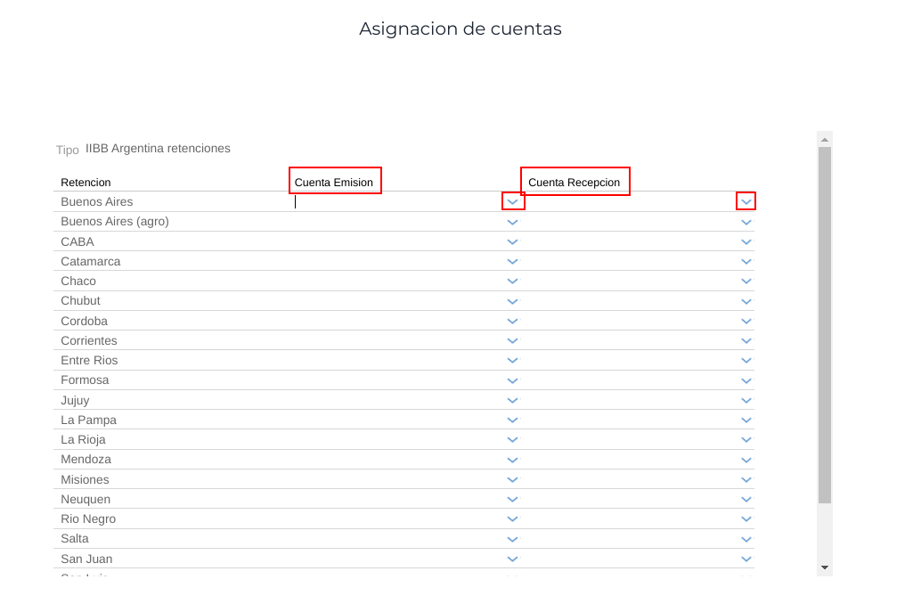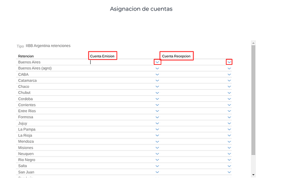 Para configurar las cuentas que se van a asociar a cada jurisdicción, se clickea el botón Cuentas del registro IIBB Argentina retenciones e IIBB Argentina percepciones y dentro de cada jurisdicción se seleccionan las Cuentas contables de Emisión y de Recepción que se desea asociar con las transacciones.