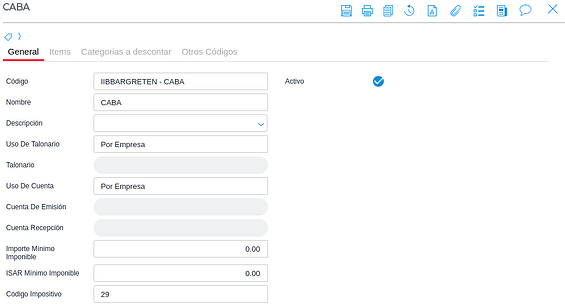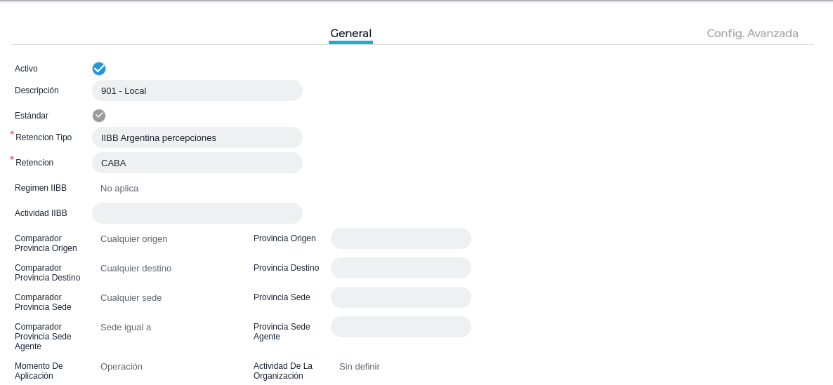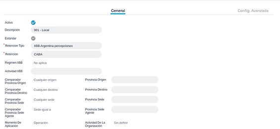 Importante: se instala preconfigurado y en los registros con la marca de estándar no son editables los campos de la solapa “General” pero pueden inactivarse estos registros y crearse otros en el caso que se necesite modificar alguna variable por cambios en la legislación provincial u otros motivos (al inactivar el estándar y crear uno nuevo se evita que calcule en forma duplicada una retención o percepción).