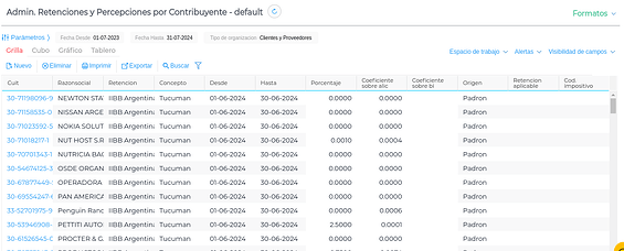 Gestión Empresarial → Impuestos → Maestros → Admin. Retenciones y Percepciones por Contribuyente