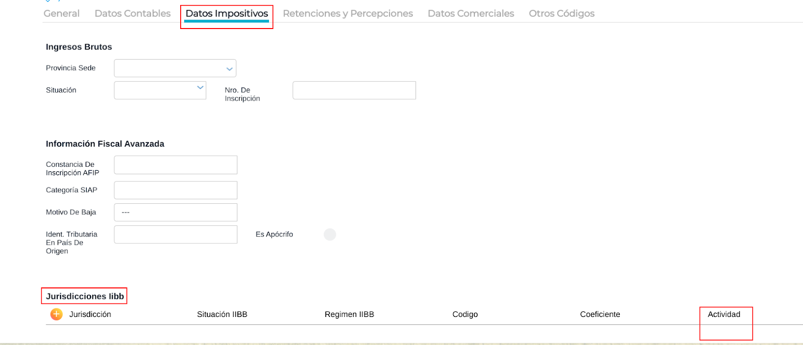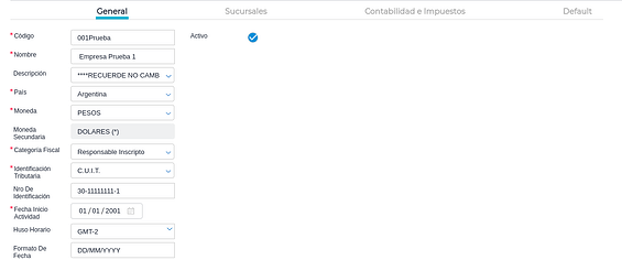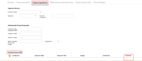 Actividad IIBB: a los fines de generar la retención/percepción en las transacciones el dato de este campo se compara con el campo “Actividad” que se encuentra configurado en el cliente o proveedor:
