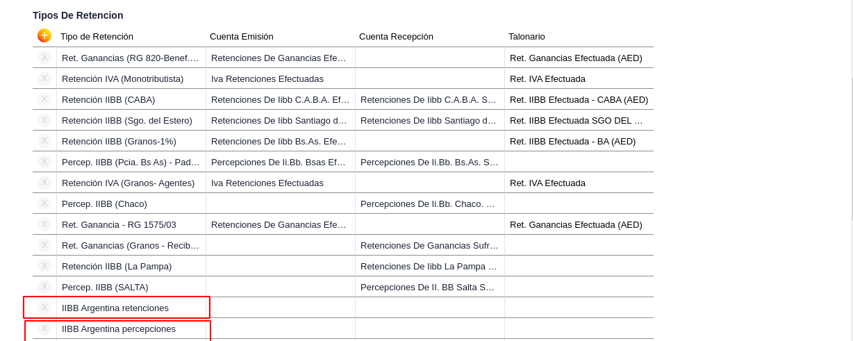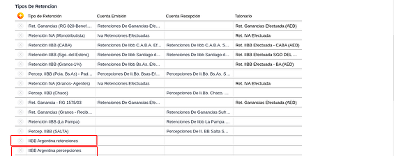 También, en caso de corresponder, se deben agregar las Percepciones aduaneras de IIBB Argentina y Recaudaciones bancarias de IIBB Argentina para poder configurarles las cuentas de recepción.