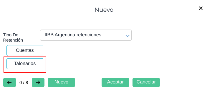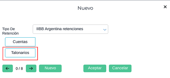 Indica el talonario que utilizará la retención/percepción. Al igual que con las cuentas, si se realiza un cambio desde este maestro modificará todas las configuraciones previas relacionadas con los talonarios que se hayan realizado para ese tipo de retención desde el Maestro Tipos de Retención, dejando como modo de uso de talonarios “por empresa”.