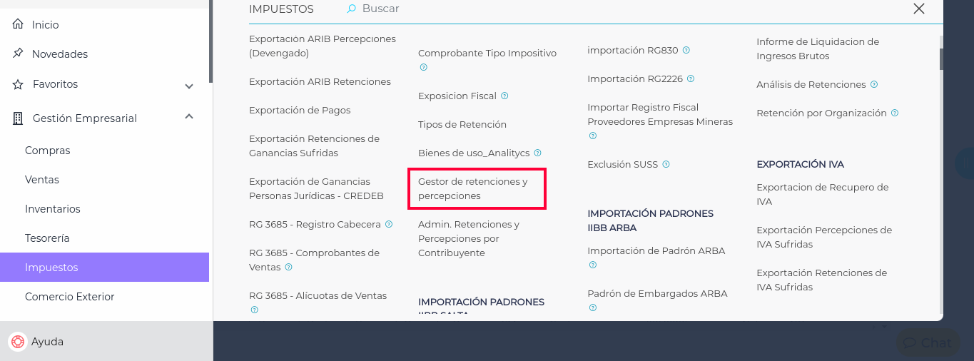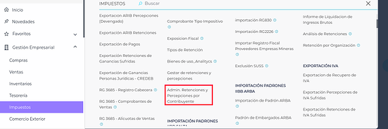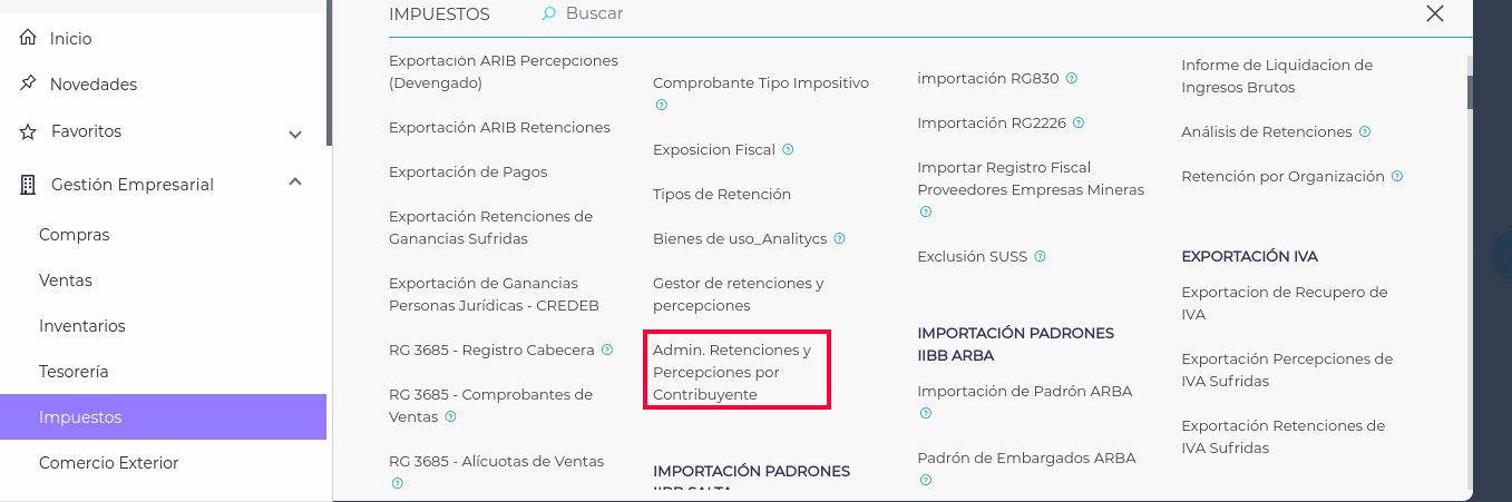Gestión Empresarial → Impuestos → Maestros → Gestor de retenciones y percepciones de IIBB
