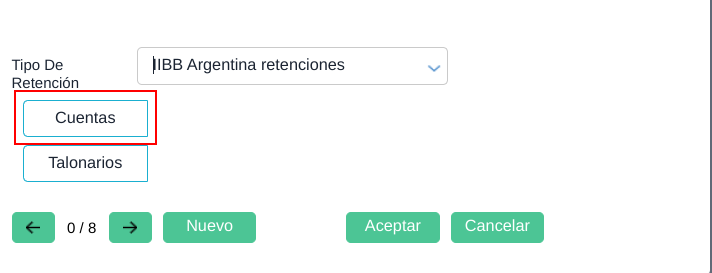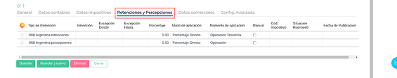 Ingresando a cada uno de estos registros es posible configurar las cuentas que impactarán en la retención/percepción efectuadas y sufridas y el talonario que se usará en retenciones efectuadas.