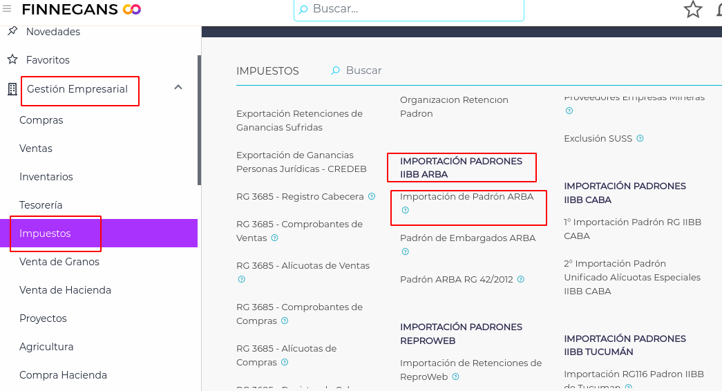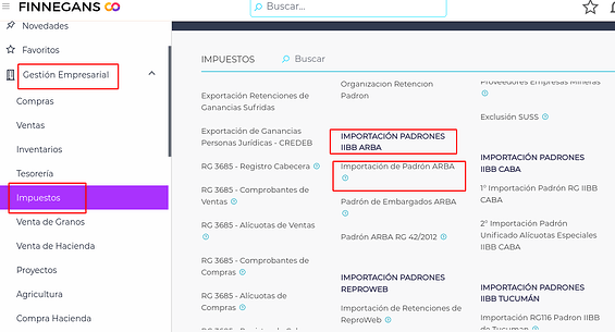Se busca el padrón que se desea importar en el menú o desde el diccionario de viewers. En este ejemplo tomamos la importación del Padrón ARBA: